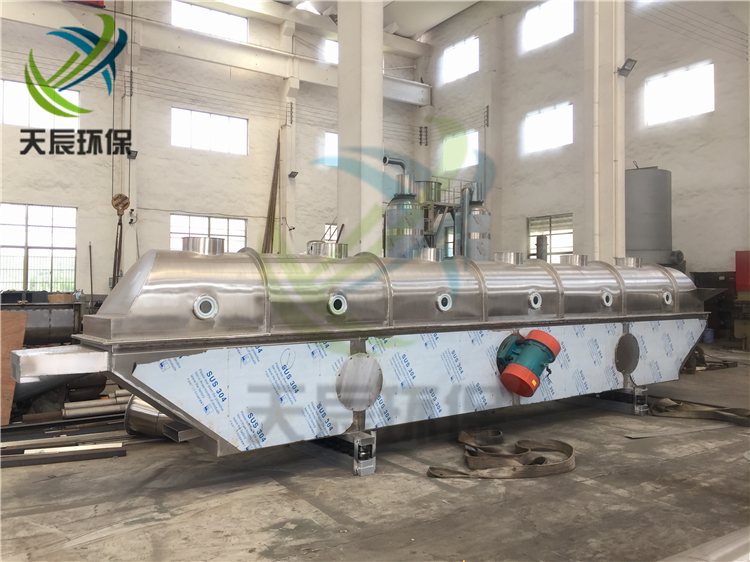 物料自進料進口進入機內(nèi),在振動力作用下,物料沿水平面流化床拋擲,向前連續(xù)運動,熱風(fēng)向上穿過流化床同濕物料換熱后,濕空氣經(jīng)旋風(fēng)分離器除塵后由排風(fēng)1:3排出.干燥物料由排料進口排出。
