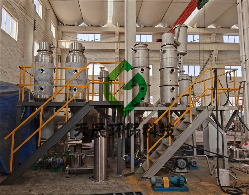 本系統一級采用降膜的蒸發工藝,物料在換熱管內內呈膜狀蒸發,換熱效率更高,循環泵的功率也會更小。