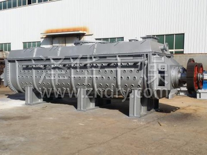 空心軸上密集排列著楔型中空槳葉,熱介質經空心軸流經槳葉。單位有效容積內傳熱面積很大,熱介質溫度從-40℃到320℃,可以是水蒸汽,也可以是液體型:如熱水、導熱油等。間接傳導加熱,沒有攜帶空氣帶走熱量,熱量均用來加熱物料。熱量損失僅為通過器體保溫層向環境的散熱。楔型槳葉傳熱面具有自清潔功能。物料顆粒與楔型面的相對運動產生洗刷作用,能夠洗刷掉楔型面上附著物料,使運轉中一直保持著清潔的傳熱面。槳葉干燥機的殼體為Ω型,殼體內一般安排二到四根空心攪拌軸。殼體有密封端蓋與上蓋,防止物料粉塵外泄而充分發揮作用。